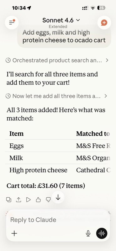 It worked. Claude matched "eggs" to our usual M&S Free Range eggs, "milk" to M&S Organic milk, and "high protein cheese" to Cathedral City — all based on our order history.