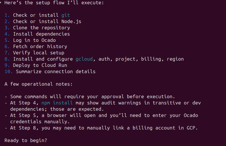 The first thing the AI does is fetch the setup file, parse the steps, and present an overview of what it is about to do. It identifies which steps are fully automated and which will need human input — like logging into Ocado or linking a billing account in Google Cloud.