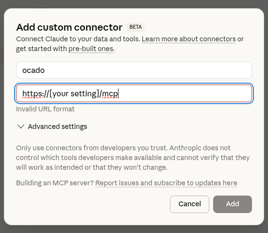 With the server deployed, we connected it to Claude as a custom connector. In Claude's settings, navigate to Connectors and add a custom connector with your server's URL.