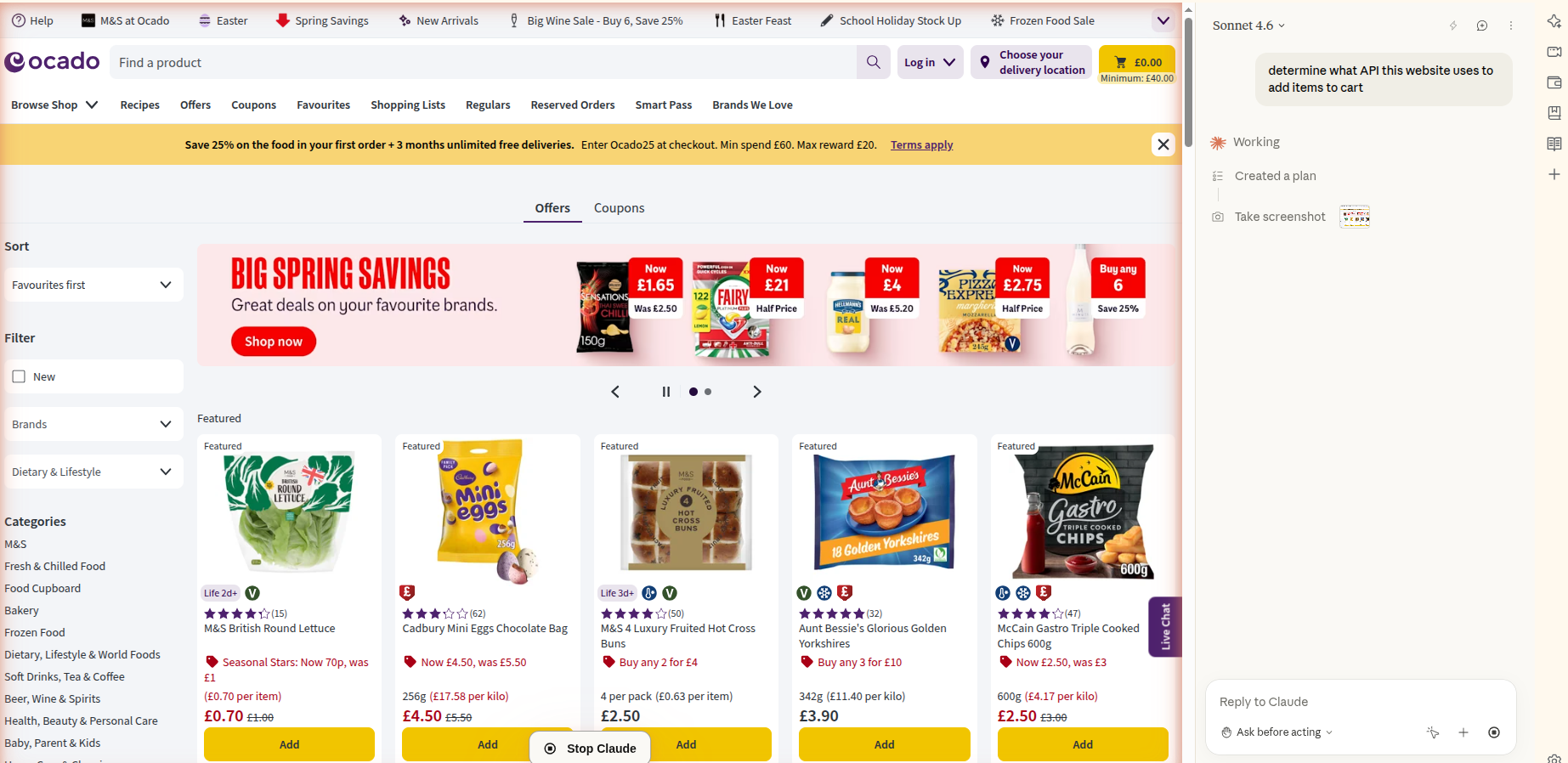 Instead of scraping web pages, we asked Claude Code to use the Chrome extension to figure out how Ocado's website communicates with its backend. Claude inspected the network requests and identified the REST and GraphQL APIs that Ocado uses for: